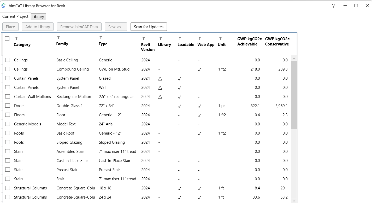 The **bimCAT Library** command allows access to a library of various Revit family types. These types could be annotated with the bimCAT data allowing to maintain user-refined collections and bimCAT builder data between different projects.