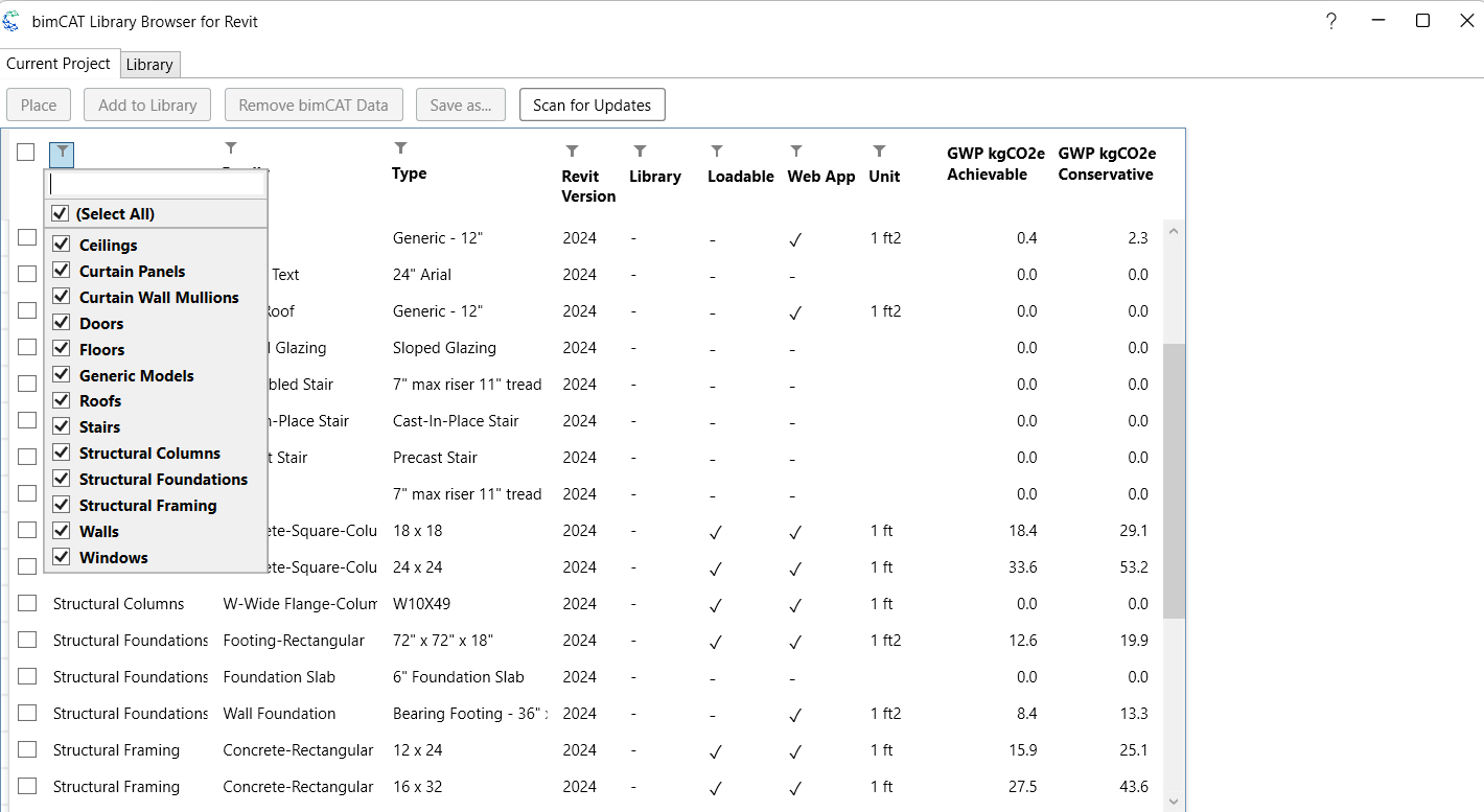 If elements of a family type were already exported to the Web App, the corresponding back annotations will be added to the family type. The **Web App** column shows whether these annotations are present. If that’s the case, the **Unit** column will display the quantity unit assigned to the family type on the Web App, and GWP Achievable and GWP Conservative columns will show off the approximate GWP values for 1 unit of this family type (calculated using the Revit material data and the bimCAT material statistics).