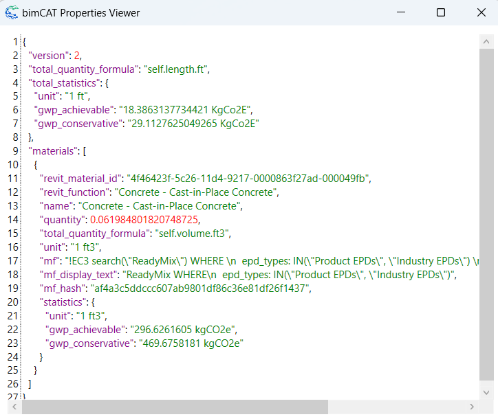Clicking the **View All** link opens the **bimCAT Properties Viewer** which shows the complete bimCAT back annotation in JSON format.