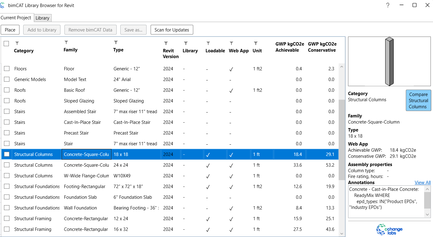 Upon clicking a particular row in the data grid, you’ll be able to see more detailed information about the corresponding family type in the right pane. It includes a **preview image**, **Category**, **Family**, **Type** and **GWP data**. Also, the **Annotation** text box displays the list of materials or material layers of the family types together with bimCAT material search information.