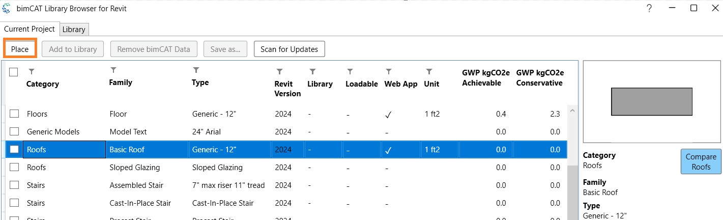 The Place button works with the item currently highlighted in the data grid ignoring the checkboxes. Allows to place an instance of the chosen family type to the current Revit view.